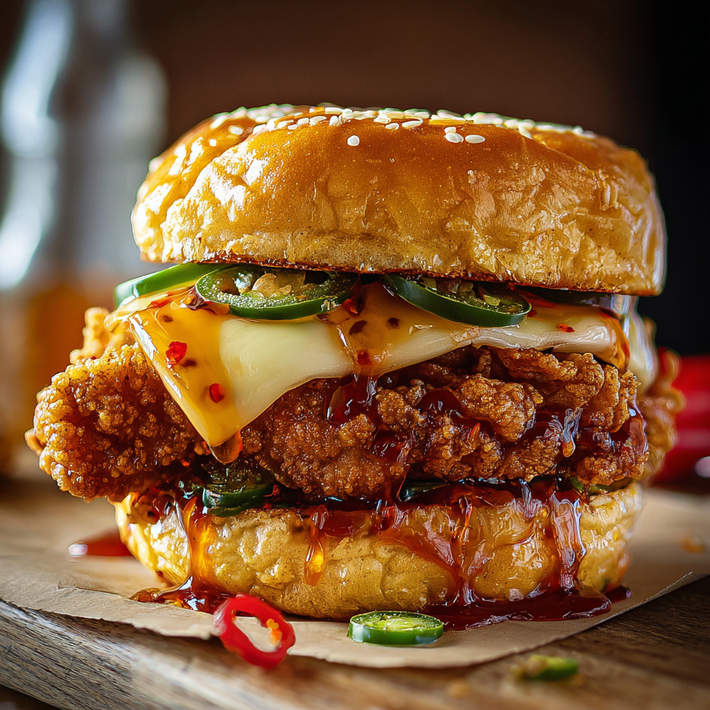 Crispy Fried Chicken Sandwich Dipped in Honey and Chili